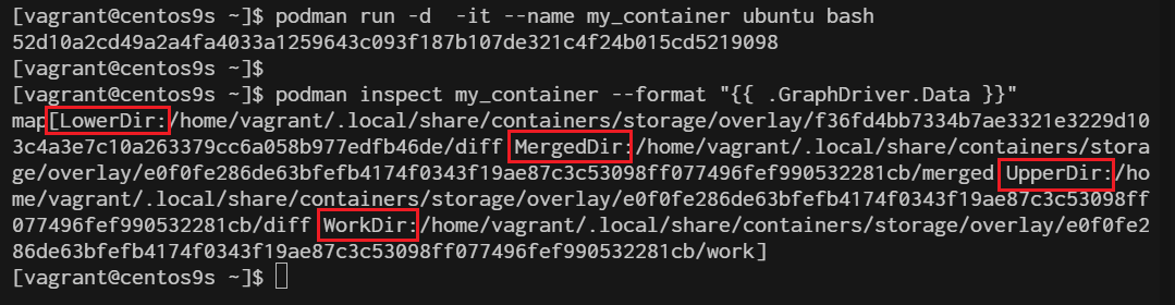 $ podman inspect my_container --format "{{ .GraphDriver.Data }}"